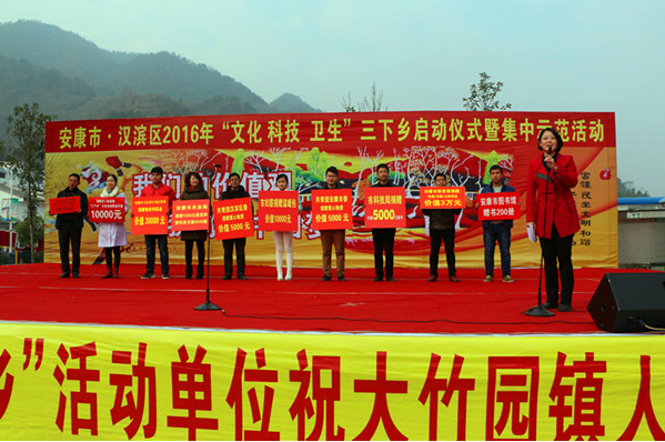 元月19日,火博体育2016年“文化科技卫生”三下乡启动仪式暨集中示范活动在汉滨区大竹园镇七堰社区举行,火博体育局长刘昌兰带领相关科室人员参加了启动仪式。