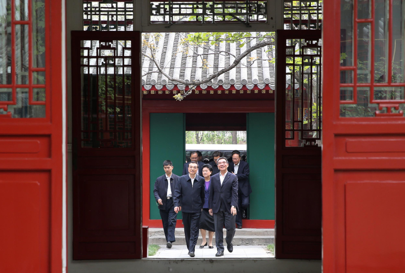 在北大国发院的“万众楼”前,总理与多位知名学者交流,了解大家的研究成果,并和大家合影留念。