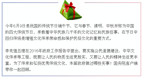 2015年10月,国务院办公厅印发《关于推进基层综合性文化服务中心建设的指导意见》,提出要弘扬中华优秀传统文化,加强非物质文化遗产传承保护和民间文化艺术之乡创建,开展非物质文化遗产展示、民族歌舞、传统体育比赛等民族民俗活动。