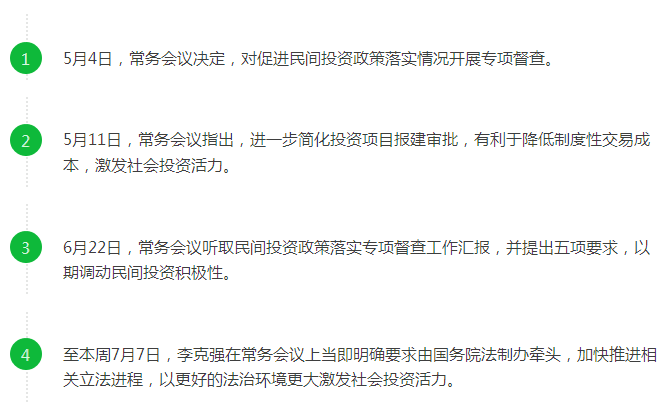 为此,国务院频频发招。据“国是星期三”(微信号:WednesdayNews)统计,从今年5月4日至今召开的9次国务院常务会议中,有4次将社会、民间投资相关内容作为议题,如下图: