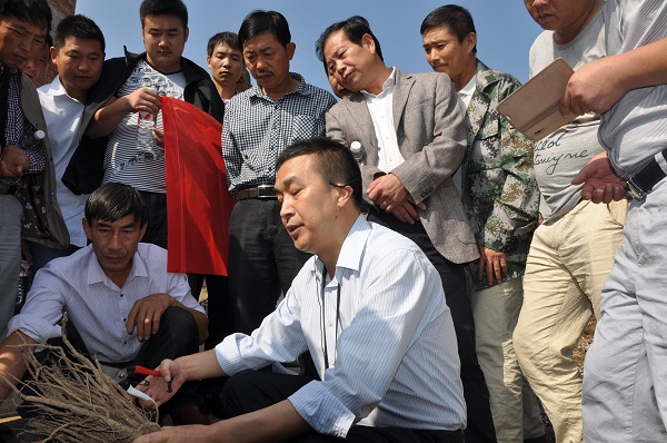 “第一是苗木要规范做好根系修剪和消毒;第二是整地划线要做到行端,稀疏合适;第三是栽植的过程要做到根舒苗端,栽紧踩实,浇上定根水。” 地边,农林科技局副局长陈自立简要地 概况了技术要点之后,一边详细讲解,一边拿起一捆苗子对根系修剪、消毒等关键环节现场演示;由于人太多,看不见操作演示的自动向林技中心主任向甲斌聚拢,一边提问,一边走进新开挖的地里,现场学习规范化栽植技术。