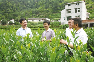市委书记郭青(左一)调研指导科技创新工作,实地了解“陕茶1号”茶树新品种选育情况。