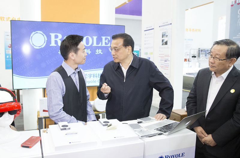 2015年10月19日,李克强总理在“全国大众创业万众创新活动周”考察6位“海归”博士所创公司的超薄柔性显示项目展示。(资料图)