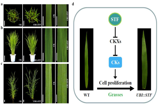 生物所通过与美国俄克拉荷马州立大学、塞缪尔?诺贝基金会和中科院等单位开展合作研究,发现过表达WOX家族基因STF能够引起水稻、二穗短柄草和柳枝稷等禾本科植物的叶片变宽、加厚,茎秆粗壮,光合效率明显提高,抗倒伏能力显著增强。统计分析发现过表达STF柳枝稷的生物产量增加近一倍,同时刈割后柳枝稷材料再生能力显著增强,表明叶型控制基因STF在提高禾本科作物生物产量方面的巨大应用潜力。进一步研究发现STF基因通过直接抑制植物细胞分裂素氧化酶家族基因表达,导致植物体内植物激素细胞分裂素的动态平衡发生改变。上述研究工作初步揭示了WOX家族基因STF影响植物叶型发育的分子调控机制,为作物高光效遗传改良和育种实践提供了重要的理论基础。
