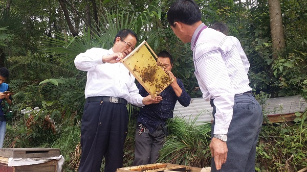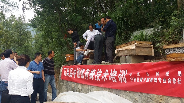 在培训会之前,黎教授一行还深入到茶里村关王沟养殖专业合作社养蜂示范点实地考察,并围绕中蜂日常管理的操作要点为大家进行了现场教学演示,解答了大家提出的一些疑问。