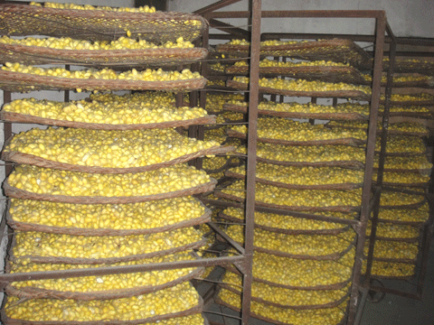 与此同时,他们还注重科技成果的转化推广,扩大天然彩色茧蚕品种饲养规模,积极探索科技成果产业化的有效路径。今年4月以来,在汉滨区五里镇刘营村、县河乡凡庙村、汉阴县汉阳镇金红村建立了优质彩色茧蚕品种饲育科技示范点,发放蚕种105张,开展饲养前期技术培训,配套发放蚕药,催青与收蚁蚕期同步实地技术指导、彩色茧收购、烘干等系列活动。在饲育阶段,强化技术指导,聘请专职技术人员定村入户、每日巡回指导,规范饲养操作方法。天然彩色茧蚕品种规模饲养喜获成功,6月份收获彩色茧4900多公斤。经调查测算,彩色茧蚕品种平均张产达46.8公斤,平均张种比普通白色蚕品种增加收入430元左右,平均张种收入2200元以上,最高张种收入2750元,为农民发家致富插上了腾飞的翅膀。