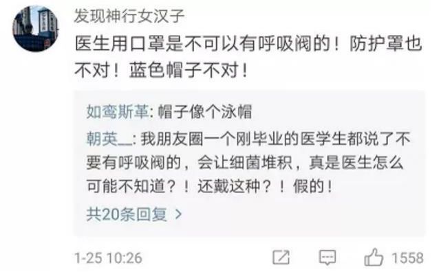1月25日,网上曝出一段自称为“武汉医护人员”名叫“瑾慧”录制的视频,称“截至当日武汉已有9万人感染”制造恐慌。细心的网友马上发现,这名“医生”是假的,并在视频中找到了证据:该“医生”连戴口罩的方法都不对,口罩还带呼吸阀。