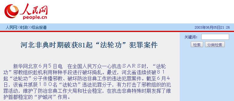 ▲权威媒体报道破获非典疫情期间“法轮功”邪教犯罪案件