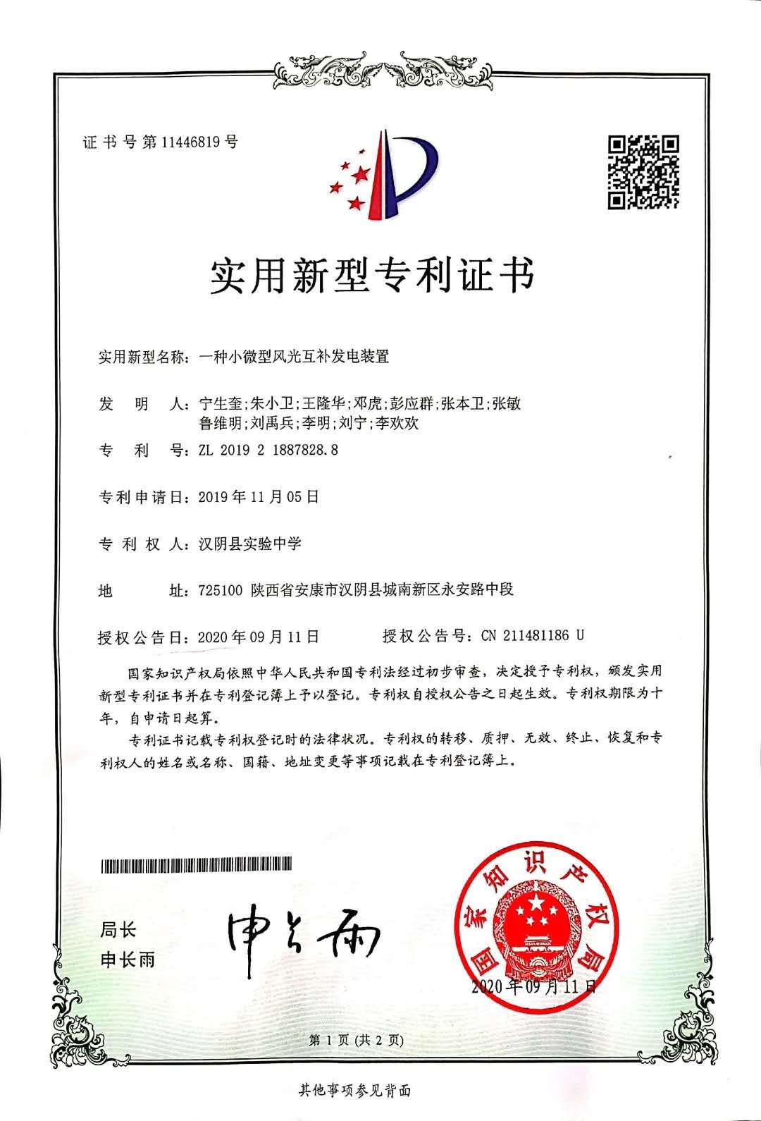 近日,由汉阴县实验中学科普活动工作室发明的“一种小微型风光互补发电装置”荣获国家知识产权局颁发的实用新型专利证书,这是自该校成立科普活动工作室以来获得的又一项国家专利。
