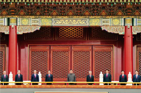 2021年7月1日,庆祝中国共产党成立100周年大会在北京天安门广场隆重举行。习近平、李克强、栗战书、汪洋、王沪宁、赵乐际、韩正、王岐山、胡锦涛等出席大会。 新华社记者 殷博古/摄