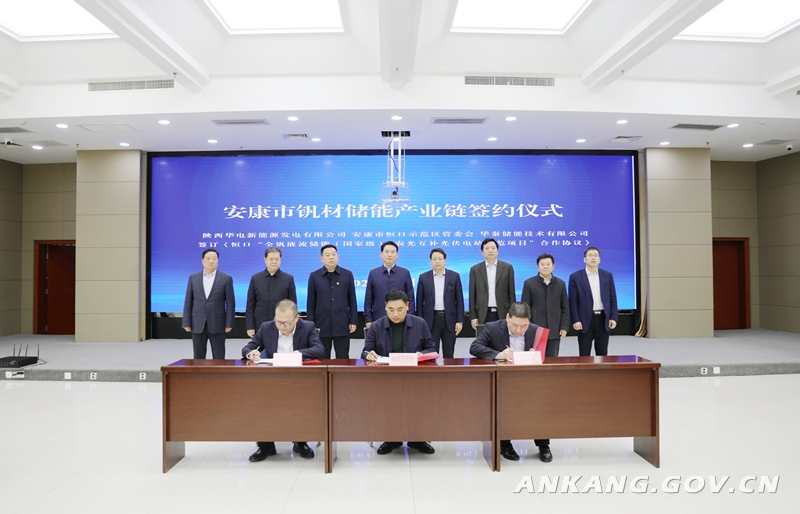 会上,赵俊民还就组建市钒材储能产业链链长制工作专班、推动液流储能示范应用等事宜作了安排部署,对与会人员提出的问题作了一一回应。华电陕西能源有限公司分别与华秦储能技术有限公司、恒口示范区签订了合作协议。