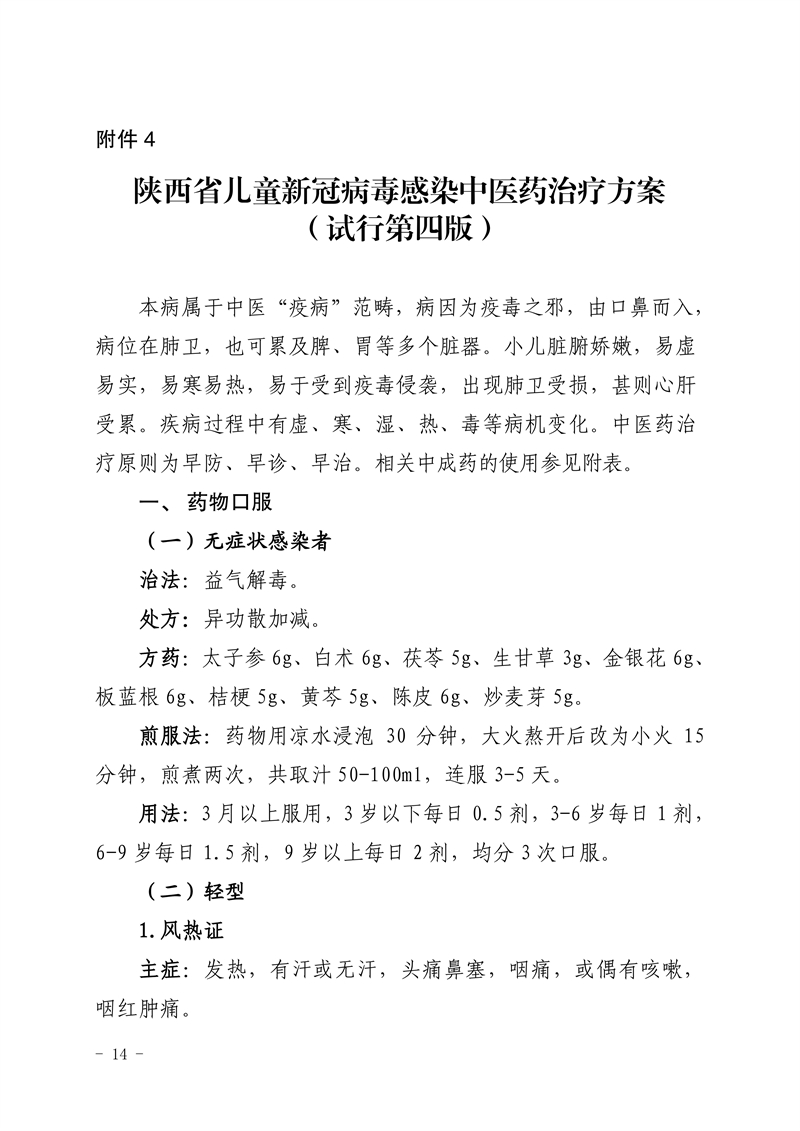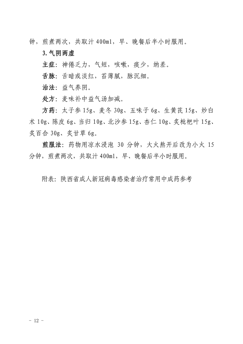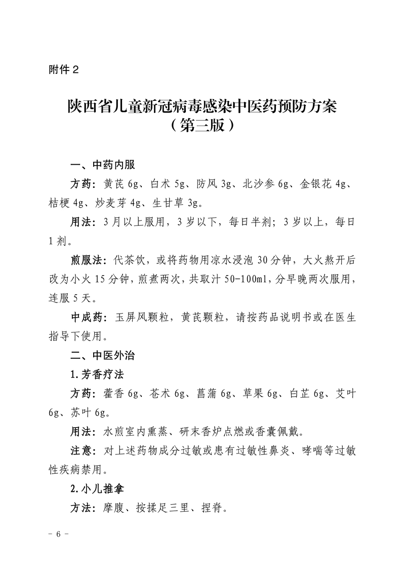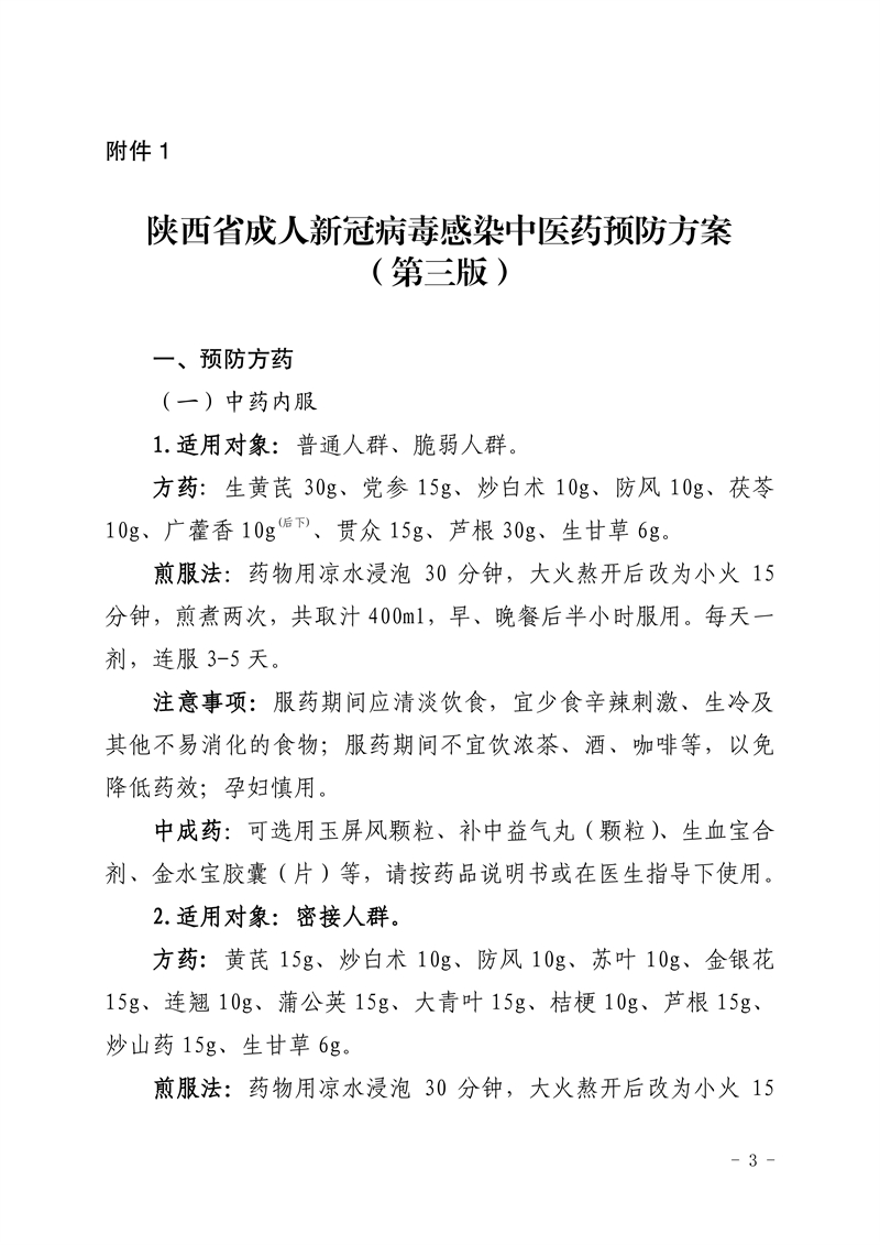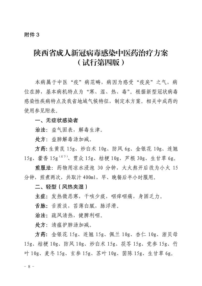 为贯彻落实国家及省委省政府关于新型冠状病毒肺炎疫情防控工作部署要求,充分发挥中医药在疫情防治中的作用,结合当前疫情防控救治工作情况,我委组织专家对原有方案进行修订,形成了陕西省新冠病毒感染中医药预防方案(第三版)及治疗方案(试行第四版),现印发给你们,请参照执行。