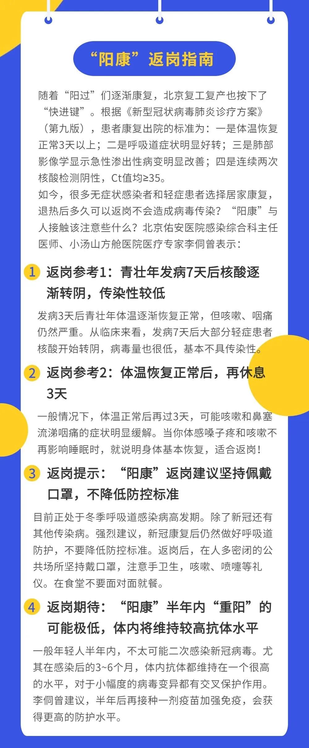 如今,很多无症状感染者和轻症患者选择居家康复,退热后多久可以返岗不会造成病毒传染?“阳康”与人接触该注意些什么?北京佑安医院感染综合科主任医师、小汤山方舱医院医疗专家李侗曾表示:返岗参考1:青壮年发病7天后核酸逐渐转阴,传染性较低。发病3天后青壮年体温逐渐恢复正常,但咳嗽、咽痛仍然严重。从临床来看,发病7天后大部分轻症患者核酸开始转阴,病毒量也很低,基本不具传染性。一般情况下,体温正常后再过3天,可能咳嗽和鼻塞流涕咽痛的症状明显缓解。当你体感嗓子疼和咳嗽不再影响睡眠时,就说明身体基本恢复,适合返岗!返岗提示:“阳康”返岗建议坚持佩戴口罩,不降低防控标准。目前正处于冬季呼吸道感染病高发期。除了新冠还有其他传染病。强烈建议,新冠康复后仍然做好呼吸道防护,不要降低防控标准。返岗后,在人多密闭的公共场所坚持戴口罩,注意手卫生,咳嗽、喷嚏等礼仪。在食堂不要面对面就餐。返岗期待:“阳康”半年内“重阳”的可能极低,体内将维持较高抗体水平。