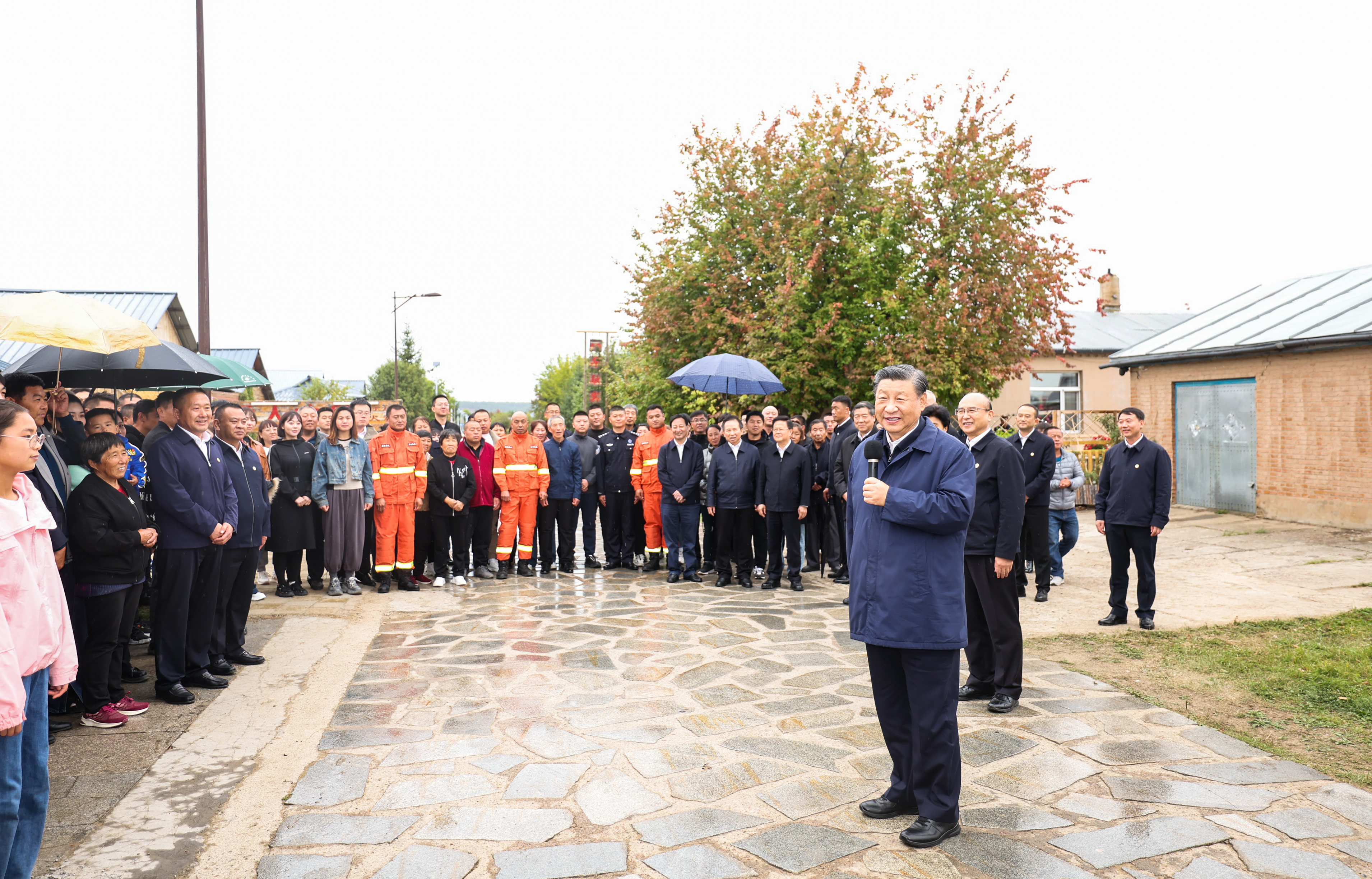 9月6日至8日,中共中央总书记、国家主席、中央军委主席习近平在黑龙江考察。这是7日上午,习近平在遭受洪涝灾害的哈尔滨尚志市老街基乡龙王庙村,同当地村民和施工人员亲切交流。新华社记者 谢环驰 摄
