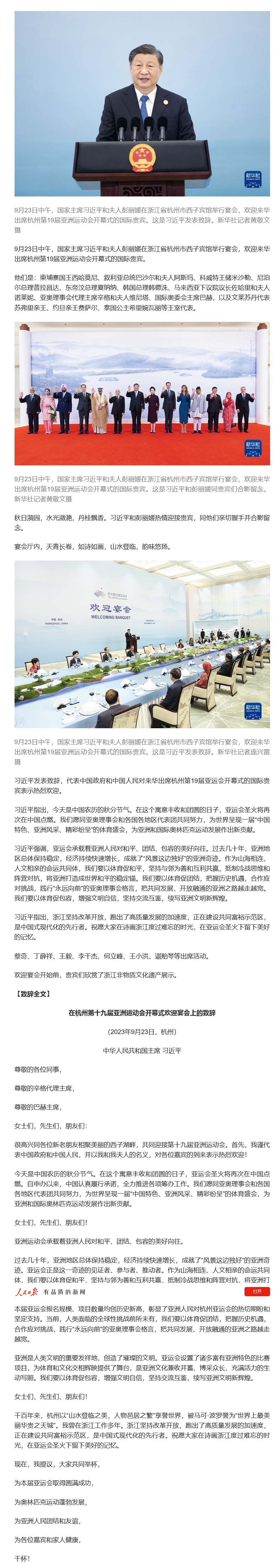 习近平和彭丽媛为出席杭州第19届亚洲运动会开幕式的国际贵宾举行欢迎宴会-火博体育