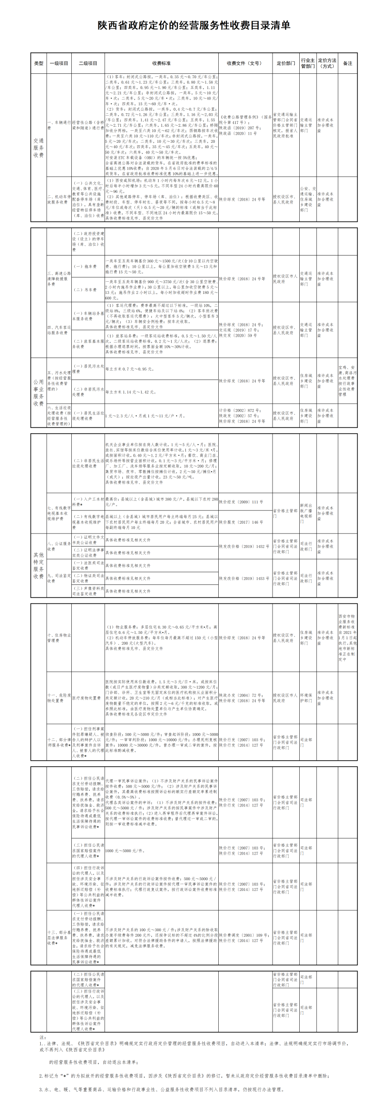 陕西省政府定价的经营服务性收费目录清单