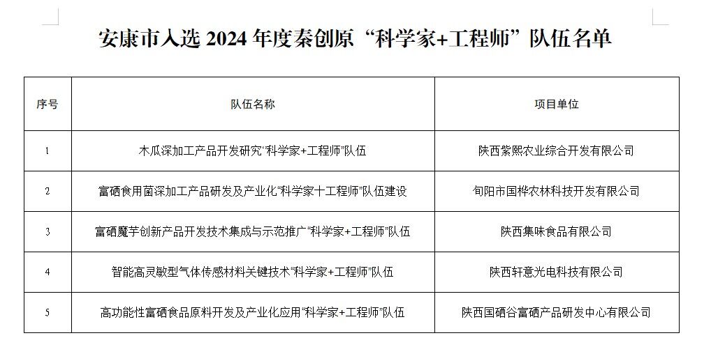 近日,省科技厅公布了2024年度秦创原“科学家+工程师”队伍入选名单,我市陕西紫熙农业综合开发有限公司、旬阳市国桦农林科技开发有限公司等5家企业牵头组建的“科学家+工程师”队伍入选,每支队伍将获得30万元财政科技经费支持。