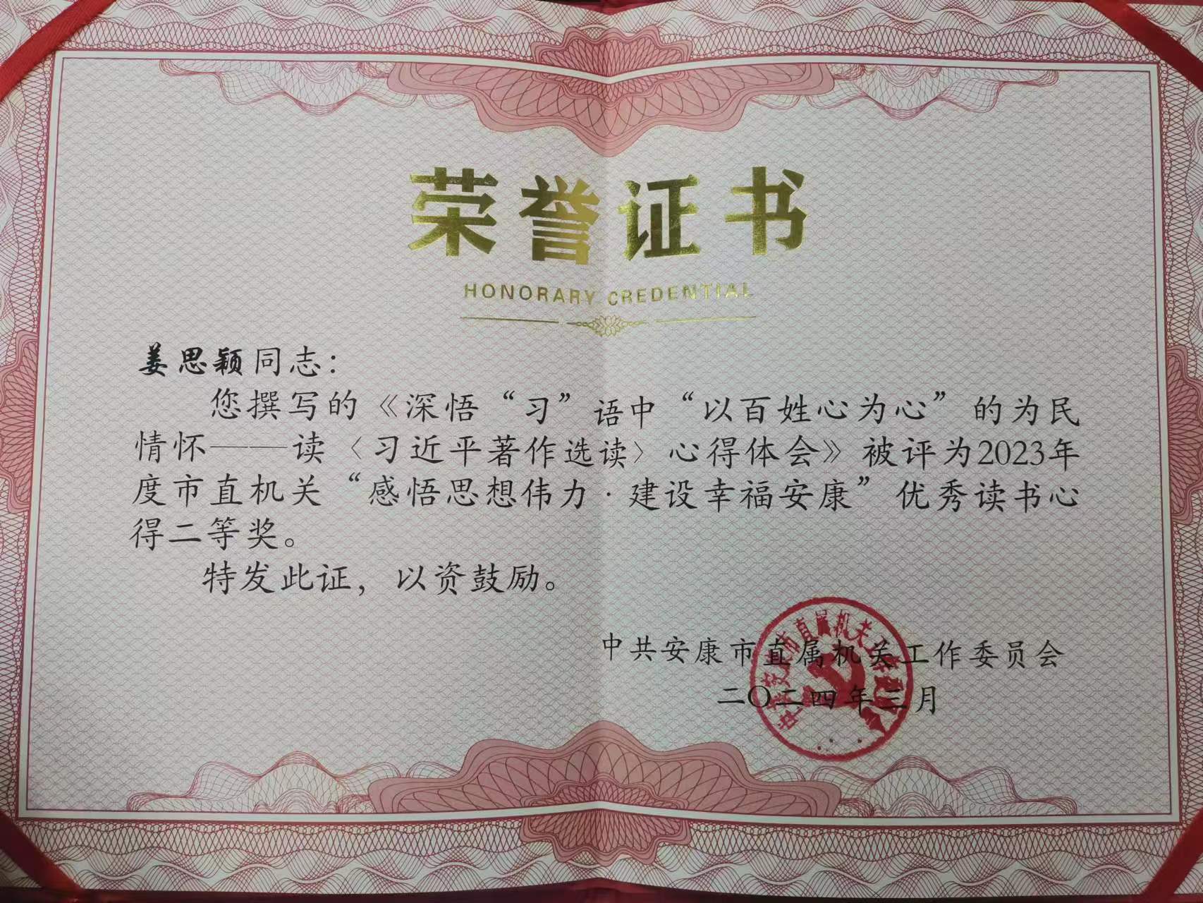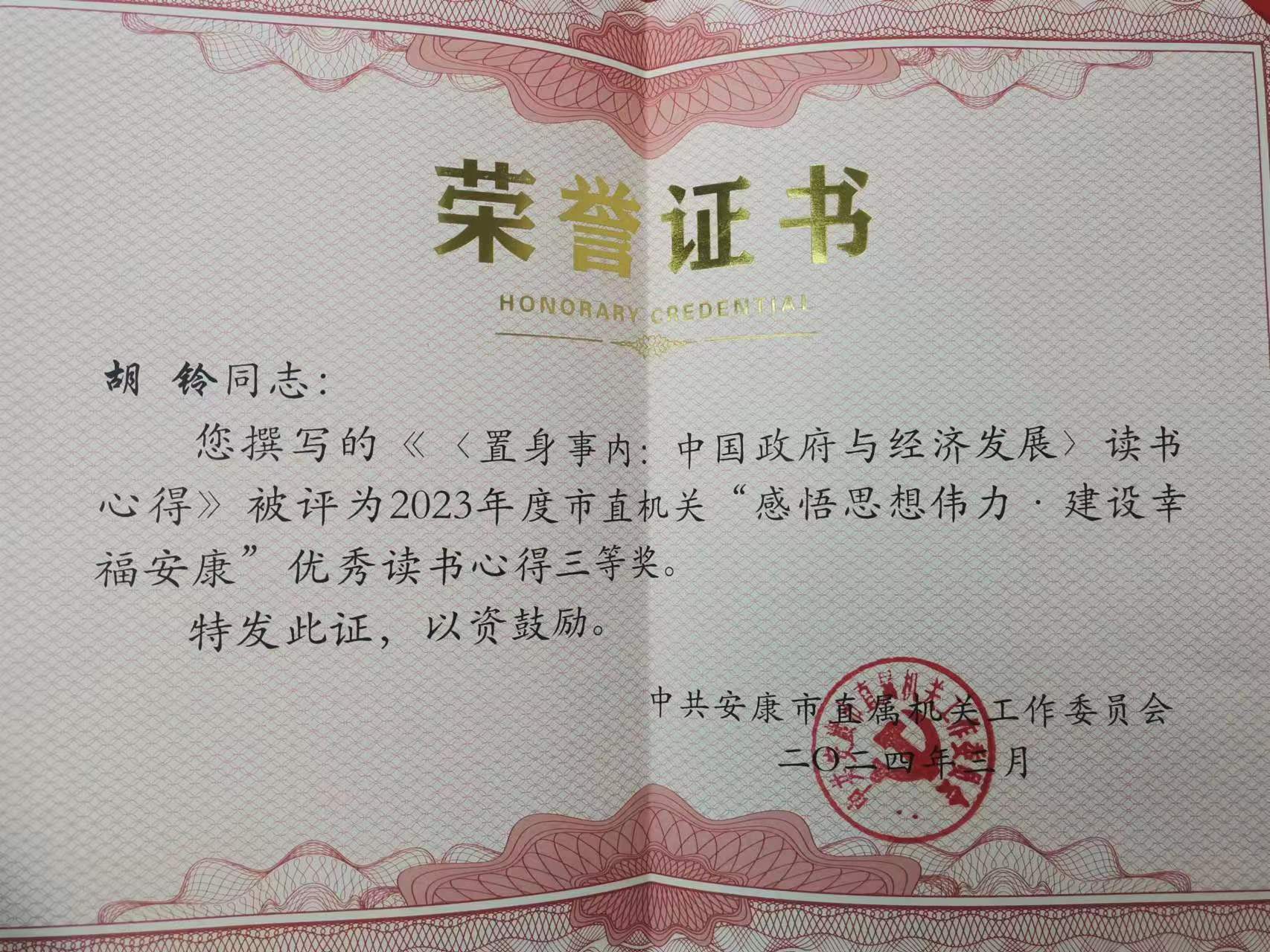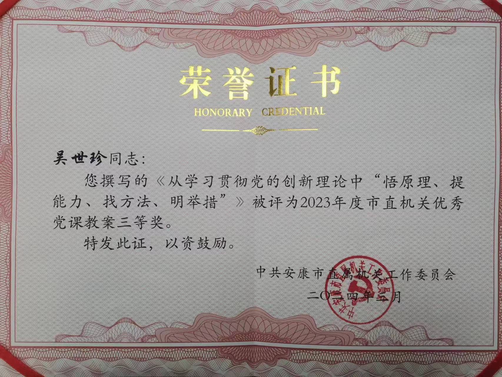 近日,中共火博体育入口直属机关工作委员会通报表彰了2023年度市直机关优秀党课教案和“感悟思想伟力·建设幸福火博体育平台”优秀读书心得,火博体育入口党组书记吴世珍的《从学习贯彻党的创新理论中“悟原理、提能力、找方法、明举措”》获评优秀党课教案三等奖,火博体育入口机关党支部党员姜思颖的《深悟“习”语中“以百姓心为心”的为民情怀——读<习近平著作选读>心得体会》获评优秀读书心得二等奖,机关党支部党员胡铃的《<置身事内:中国政府与经济发展>读书心得》获评优秀读书心得三等奖。