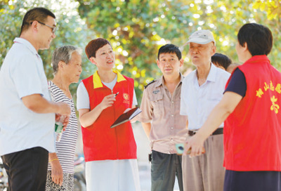 安徽淮北市相山区东山街道建国社区通过“村务会商”“邻里说事拉理”等方式,实现矛盾纠纷和群众诉求“一站式”解决。图为社区志愿者与群众交流。 |