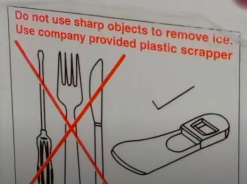 但如果用尖锐物品,在上面划过来划过去,那情况就完全不同了。所以除冰时,尖锐的刀子极有可能划破冷冻室内壁。