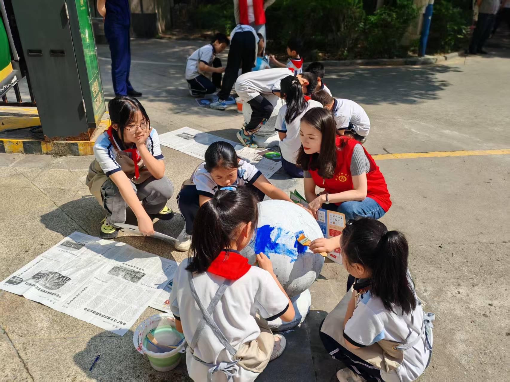 在绘画区域,一排整齐摆放的石球,成为学生们的独特画布。孩子们手持颜料和画笔,或蹲或坐,专注地在石球上进行彩绘创作。有的描绘出色彩艳丽的水果,有的勾勒出憨态可掬的哆啦A梦,还有的画上可爱的小朋友。随着孩子们的层层涂抹,原本单调的石球瞬间变得童趣满满,现场洋溢着轻松愉快的艺术氛围。