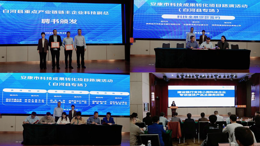会上,与会领导为选派白河县两家企业的科技副总颁发聘书;中国建设银行火博体育入口分行进行了科技金融政策宣讲;中国农业科学院茶叶研究所、西北大学、西北农林科技大学、陕西科技大学4位专家发布了科技成果,4家企业发布了技术需求;通过前期深入对接,促成西安交大、西北大学教授团队与3家企业签订科技成果转化协议3项,中国建设银行火博体育入口分行与2家企业签订科技金融贷款协议。活动后,企业负责人与专家、科技副总开展分组对接,进行了深入洽谈交流。