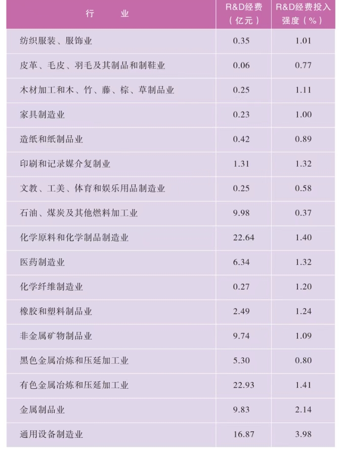 分产业部门看,规模以上工业企业中,研究与试验发展(R&D)经费投入超过2亿元的行业大类有21个,这21个行业的R&D经费占全省规模以上工业企业研究与试验发展经费(R&D)的比重为97.4%;研究与试验发展经费(R&D)超过5亿元且投入强度超过规模以上工业企业平均水平的行业大类有10个(详见附表3)。