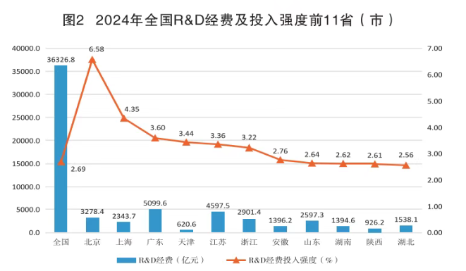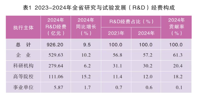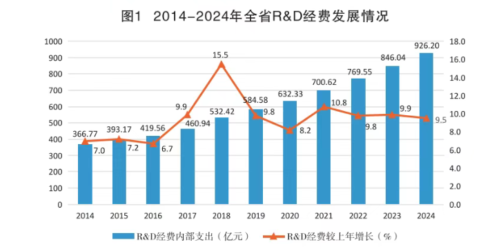 2024年,全省研究与试验发展(R&D)经费926.20亿元,比上年增加80.15亿元,增长9.5%;研究与试验发展(R&D)经费投人强度(研究与试验发展经费与地区生产总值"之比)为2.61%,较上年提高0.12个百分点"。按研究与试验发展(R&D)人员全时工作量计算的人均经费支出为53.31万元,较全国平均水平高5.31万元。